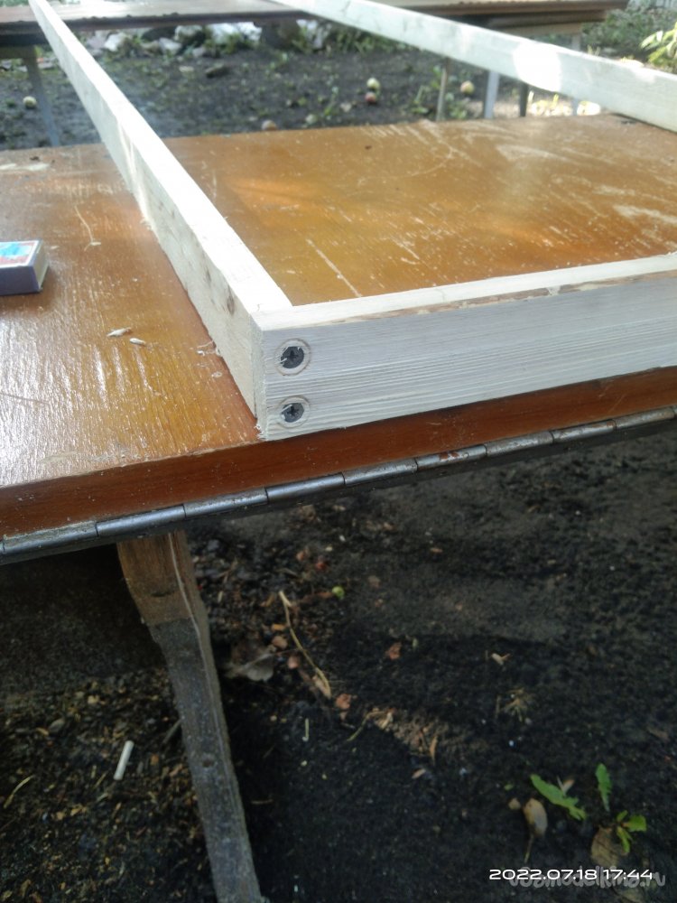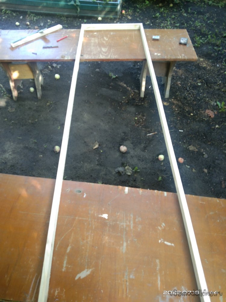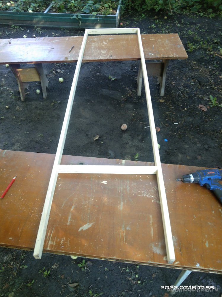 Первый шаг - это изготовление и сборка несущей конструкции, той, на которой растения будут плестись. Для этого мне понадобилось распустить брус 60*40 мм на две половинки. В итоге получается два бруска, размерами 25*40 мм. Отпиливаю две заготовки необходимой мне длины для боковых перекладин и две - для поперечных, чтобы с их помощью собрать заготовки в единую конструкцию. Все детали соединяю саморезами, без клея. Из получившихся заготовок делаю прямоугольник, нижняя поперечная перекладина которого поднята немного выше от края длинных брусьев. В этом месте будет собираться ящик. Собранную конструкцию зачищаю и шлифую.