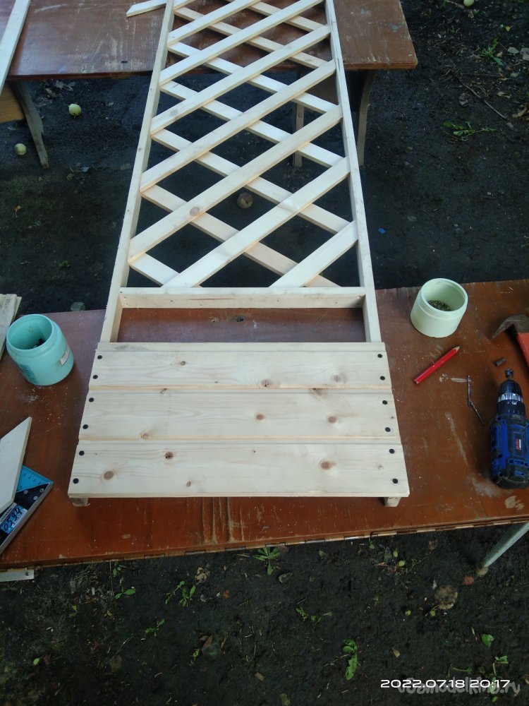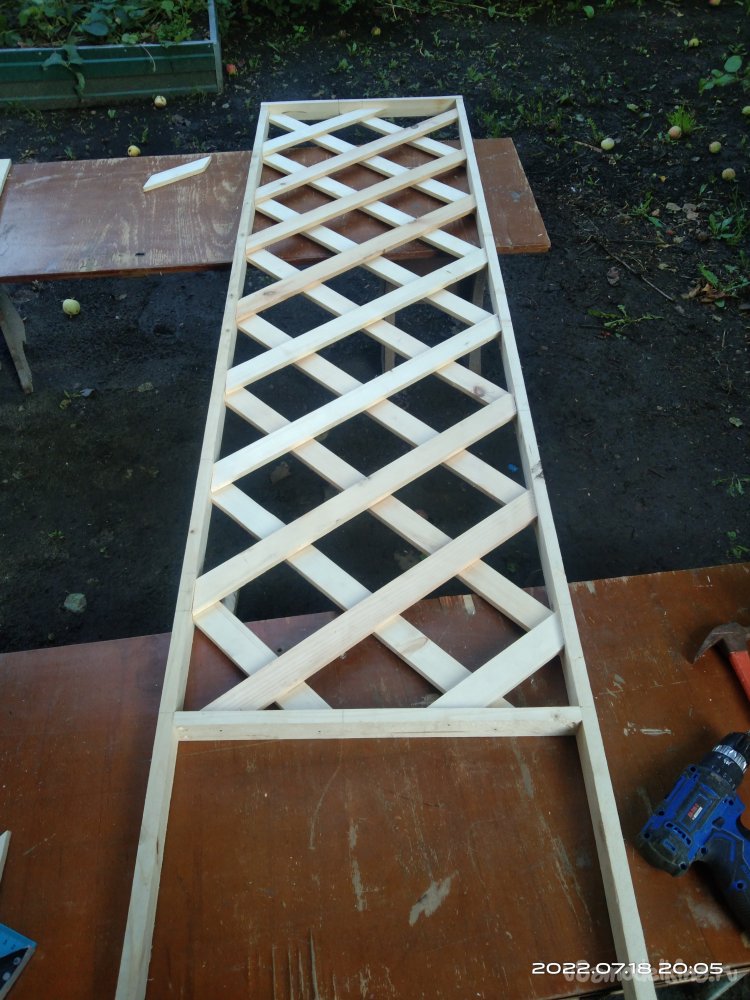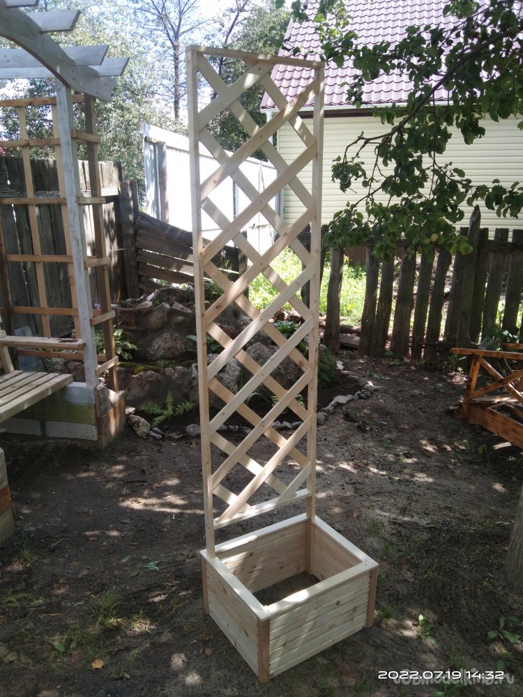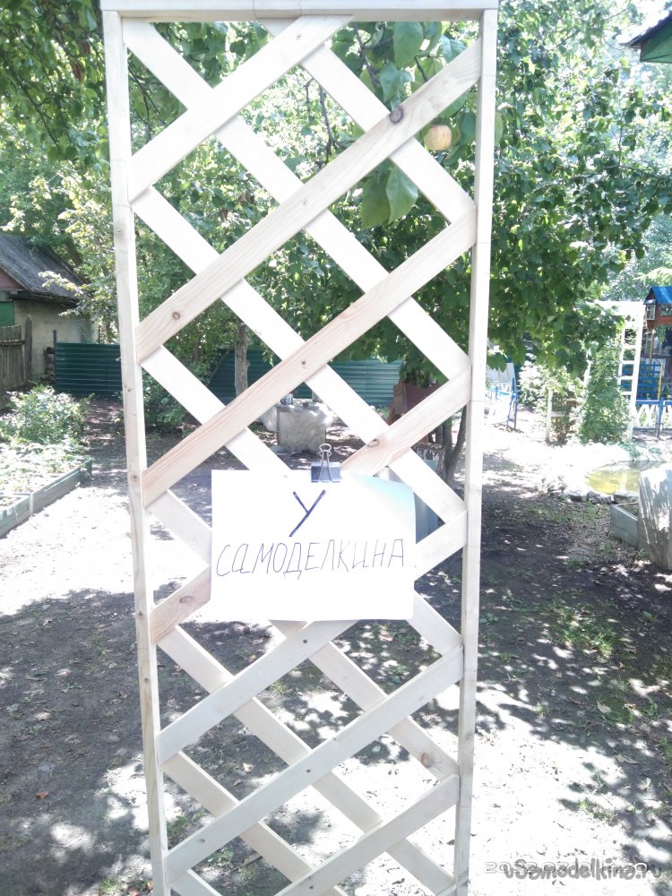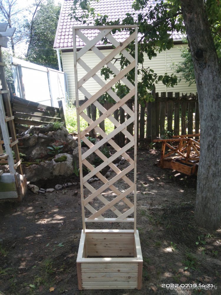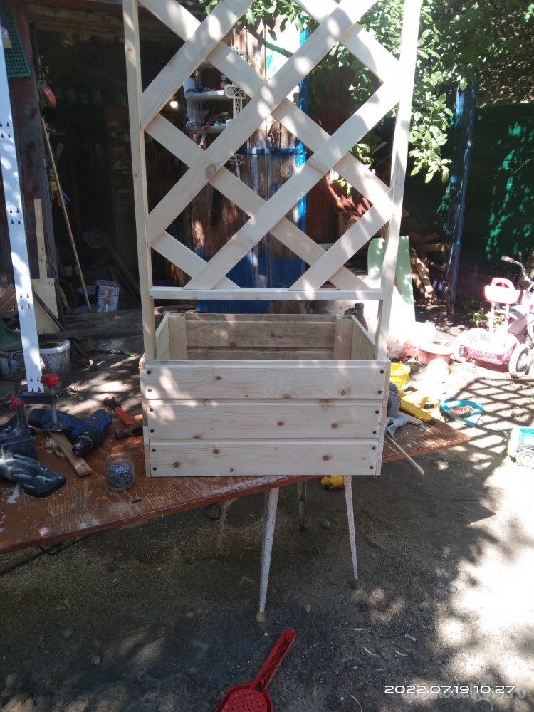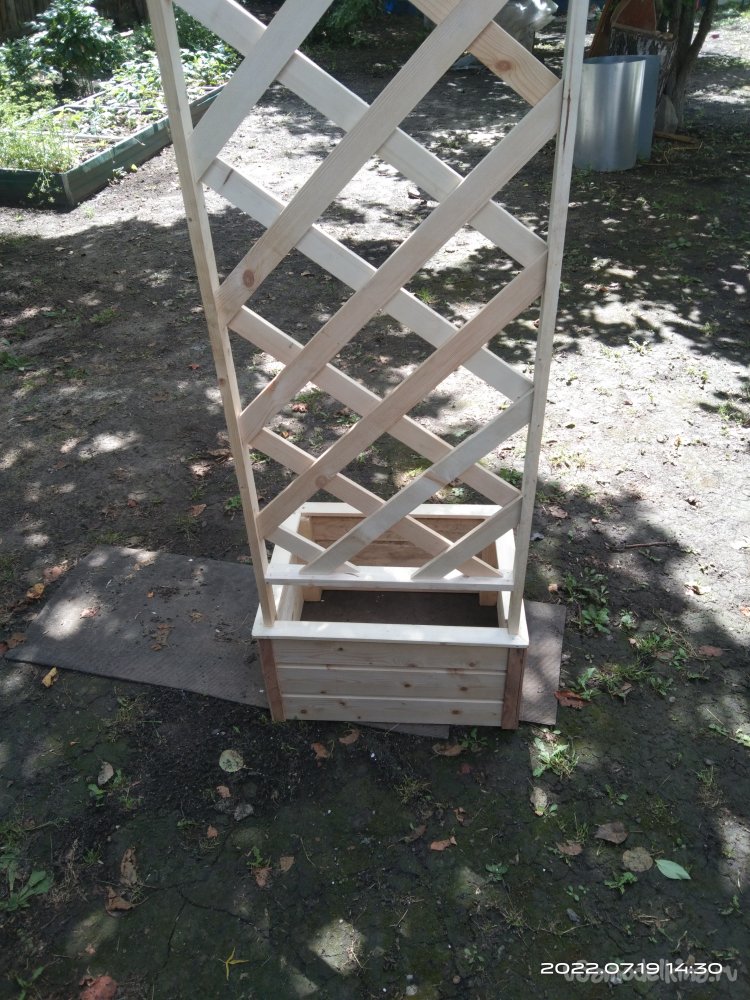 Последний этап - это покрытие готового изделия пропиткой, которая предохраняет от влаги и плесени. В конечном итоге полученным результатом я остался доволен. Данную шпалеру можно поставить в абсолютно любое место на приусадебном участке, она не закреплена жестко к определенному месту, что так же является ее преимуществом. В ящик можно поставить какую-нибудь емкость для растений, или же застелить пленкой. При необходимости все можно спокойно вытащить и перенести изделие на другое место. Или же убрать на зиму в какое-то помещение.