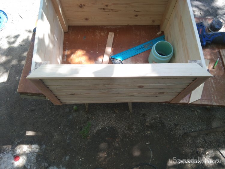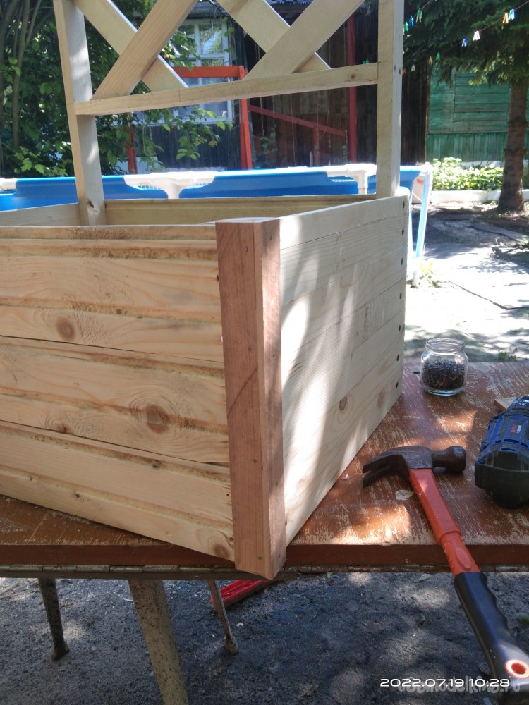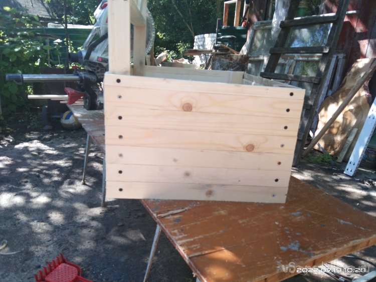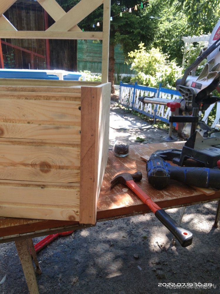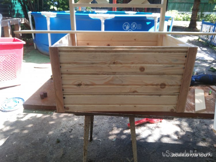 Теперь необходимо изготовить ящик для растений. Он, так сказать, будет встроенный. Передняя и задняя стенки изготовлены из вагонки, оставшейся от каких-то других проектов. Нарезаю заготовки необходимого мне размера и начинаю закреплять их на основе шпалеры. Вагонка с пазами, поэтому стараюсь плотно прижать детали в эти пазы. Затем все детали креплю саморезами. Аналогично изготавливаю переднюю стенку ящика, за исключением того, что она уже "самостоятельная", т.е. изготавливается отдельно. Собирается на брусках. Для того чтобы собрать боковые стенки, я уже использовал бруски 10*40 мм. Вагонки больше не было. Но и бруски, и вагонка имеют одинаковую толщину, поэтому не приходится заготовки подгонять под один размер. Собираю все в единую конструкцию. Вот что получается в итоге.