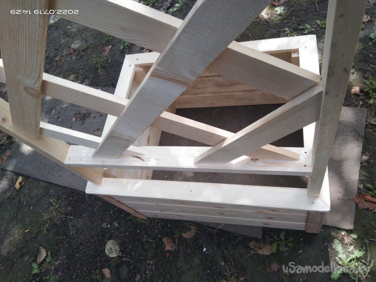 Теперь необходимо изготовить перекрестные планки на основе, обрешетку, чтобы растения могли по ним плестись. Для этого были использованы бруски размерами 10*40 мм. Для того, чтобы расстояние между этими деталями было одинаковым, я использовал шаблон. На торцовочной пиле отрезал нужные углы и закреплял заготовки внутри прямоугольной основы с помощью гвоздей и клея.