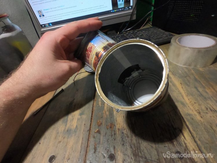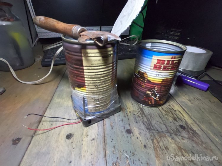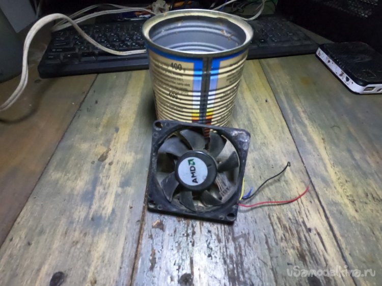 В качестве ветродуйки используем вентилятор от ПК, подобрал к нему по диаметру консервную банку. Ну а далее вставляем 4 гвоздя и обматываем скотчем. Держится очень крепко, нагрева здесь не будет, так что за это место можно не переживать.