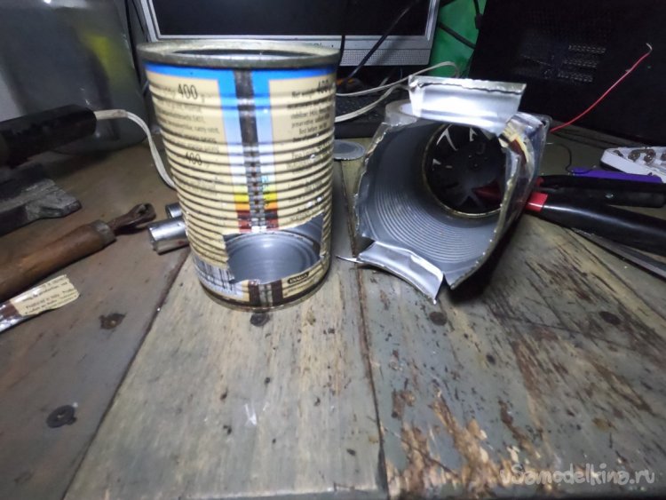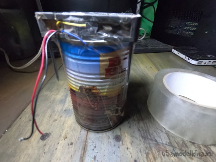Дно банки вырезаем и пробуем запустить вентилятор, он включается от напряжения 4.2В, но крутит вяло, от 8В крутит уже веселее, ну а от 12В наверно работает даже чрезмерно сильно, так что можно подобрать резистор для переключения режимов.