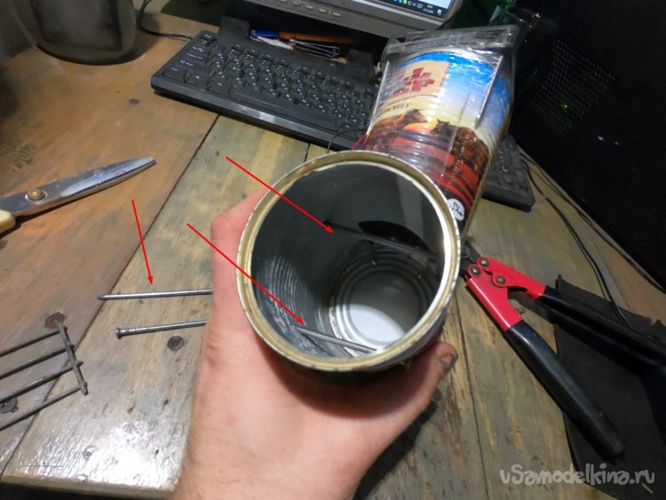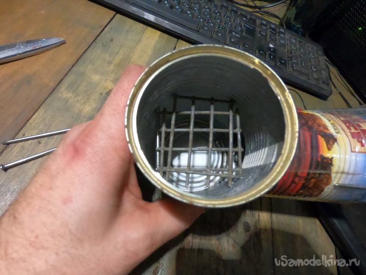 Из решетки вырезаем колосники, на которых будет гореть уголь. В качестве опор вставляем в банку два гвоздя. Вот и все, укладываем колосники и конфорка готова!