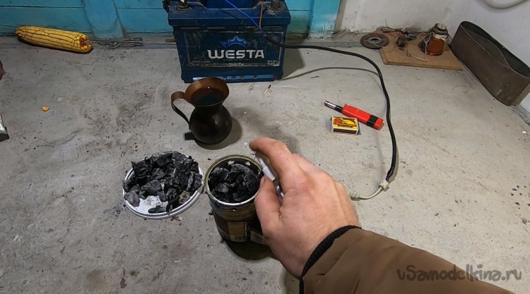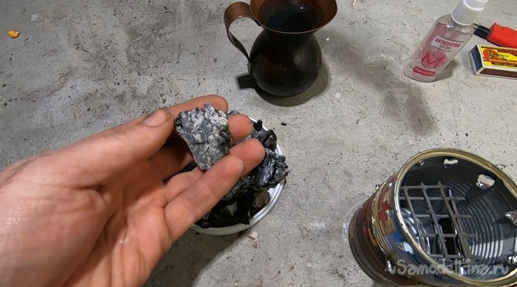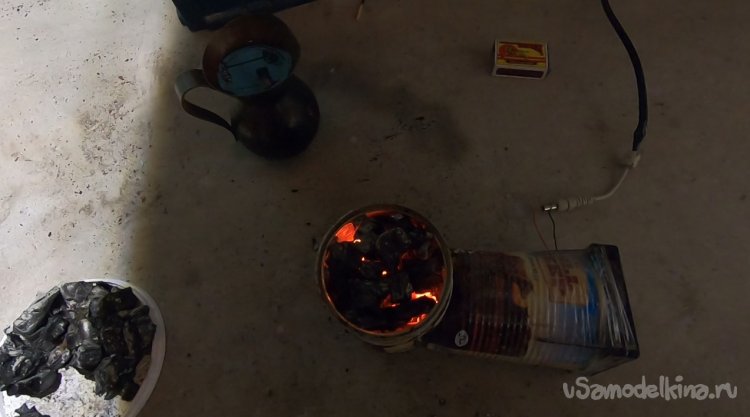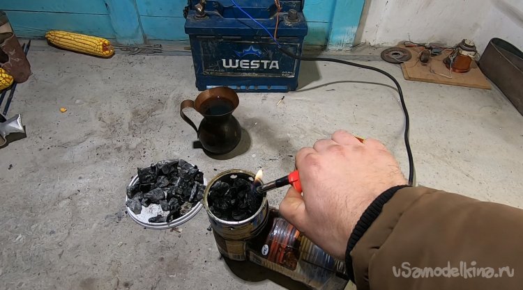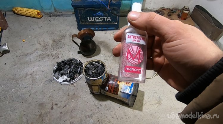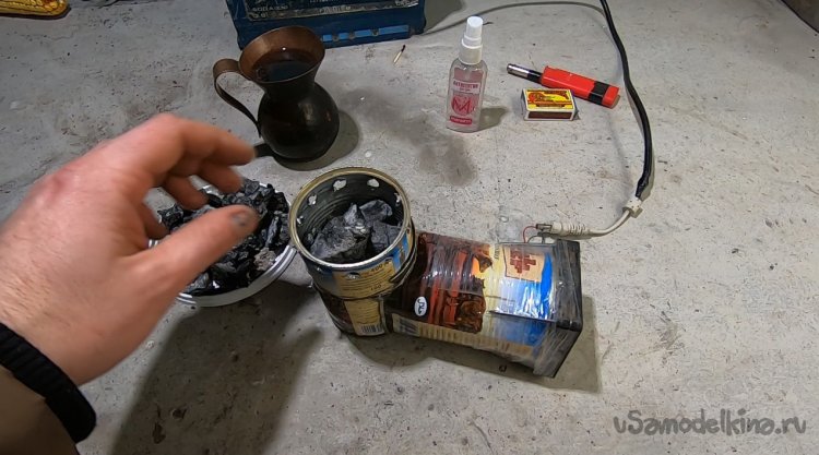 Укладываем уголь и распыляем средство для дезинфекции рук, у меня оно на спирту и отлично горит. Через некоторое время включаем вентилятор, и начинается раздув углей.