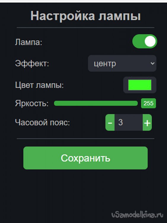 Для доступа к настройкам лампы необходимо подключить ее к локальной сети (при включении зажать кнопку, подключиться к точке доступа лампы и указать нужный SSID и пароль). После подключения к локальной сети на дисплее будет отображен бегущим текстом выданный роутером IP. Этот IP нужно ввести в строке браузера. Если все сделано корректно – откроется окно настроек. Для сохранения настроек в памяти МК нужно нажать кнопку «Сохранить».