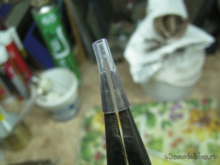 Фото 3. Кусочек даже жесткого шланга нетрудно растянуть изнутри. Круглогубцами, пинцетом и подобным инструментом. Без вандализма, в несколько осторожных подходов. На короткое время такое расширение сохранится, через пол минутки шланг восстановит свою первоначальную форму.