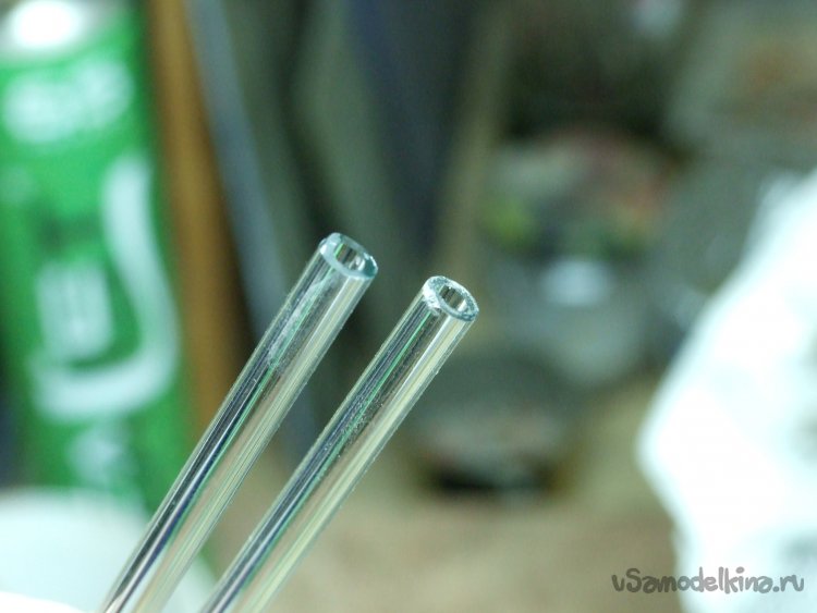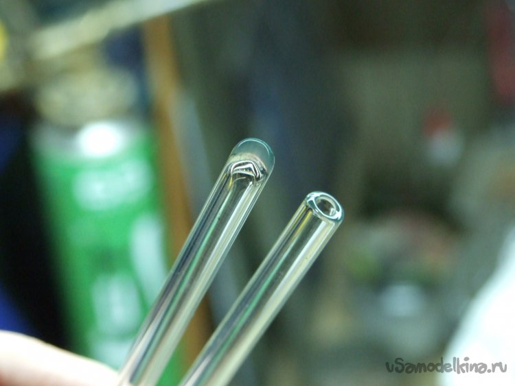 Фото 4. Снабдим пробками ручки-державки из нетолстой, Ø5 мм, штенгельной трубочки. Отрежем два куска от полутораметровой заготовки – чиркнем стеклодувным ножом или гранью алмазного надфиля риску поперек трубочки, разломаем ее с растягиванием в этом месте руками. Имеем разлом с острыми краями способными поранить как мягкий шланг, так и губы мастера при поддуве.