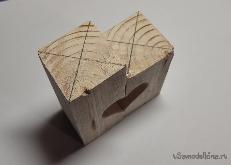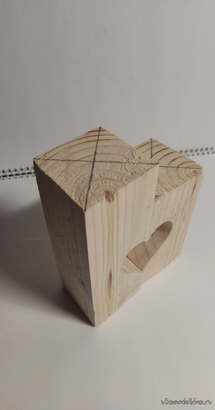 9. При создании отверстия-углубления для свечей, необходимо нанести разметку. На торце бруска проводим диагонали карандашом, находим заветную точку-центр, которую накалываем шилом. После этого нам потребуется перьевое сверло и сверлильный станок. Закрепляем сверло в станок, подставляем заготовку, соотносим наконечник сверла и отмеченное ранее шилом место, осуществляем сверление на глубину нашей чайной свечи. Аналогичную операцию проводим для другой детали.