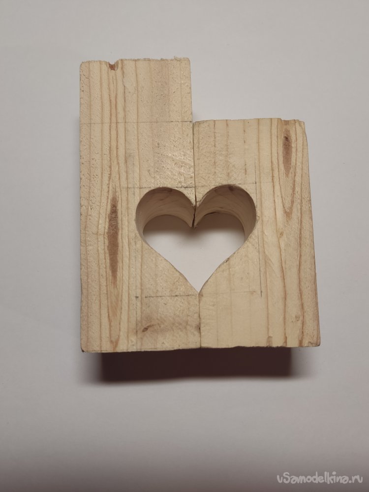 5.Кладём два бруска так, как они будут располагается в изделии. Сверху прикладываем «бумажное сердечко», оцениваем внешний вид, если что-то не устраивает, делаем новое, в общем, добиваемся одобрения «внутреннего я»