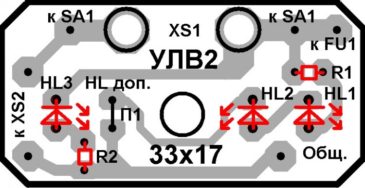 Все компоненты УЛВ2 (кроме элементов SA1, XP1, FU1) располагаются на ПП – см. рисунки 4 и 5 - выполненной из фольгированного стеклотекстолита размерами 35 х 17 мм. и толщиной 1,0 … 2 мм.