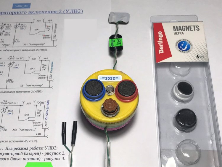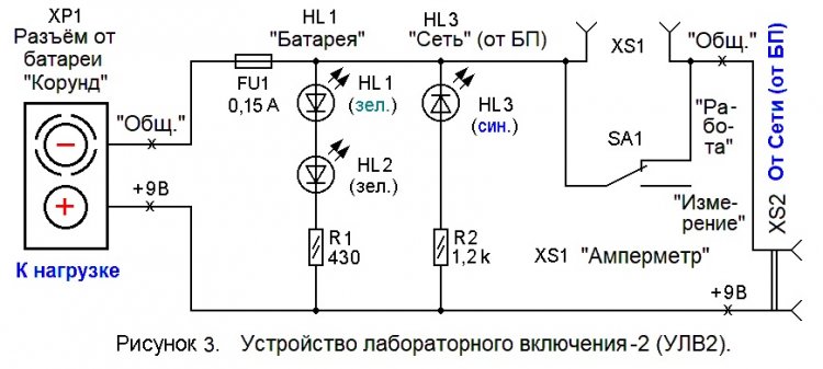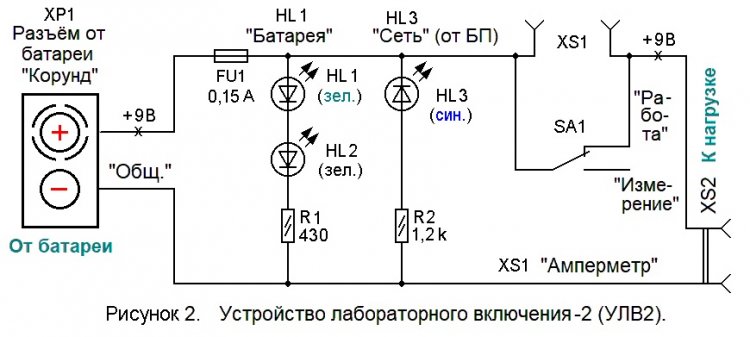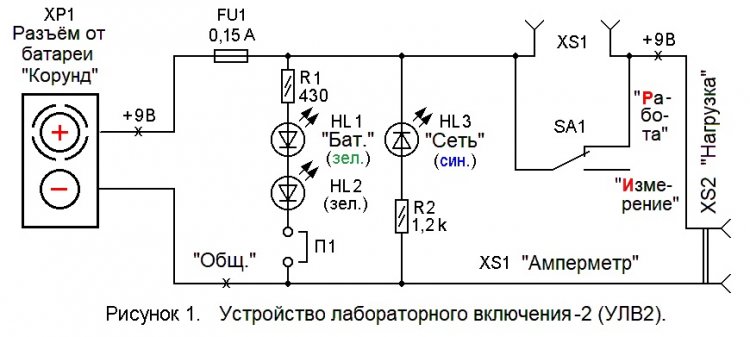 Устройство лабораторного включения (далее просто УЛВ2) предназначено для упрощения работы с низковольтными поделками при их настройке и регулировке с питанием через разъём от батареи «Корунд» (от батареи или аккумулятора). А также от сетевого блока питания.