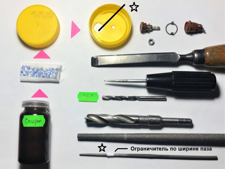 Дата изготовления сока с пробки смывается многократным протиранием ветошью, смоченной в спирте. Пазы в отверстии под держатель предохранителя пропиливаются треугольным надфилем. Ограничитель хода надфиля сделан кусочком изоленты так, чтобы ширина пропиливаемого паза составила 3 мм.