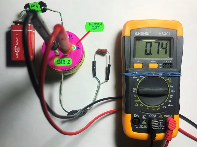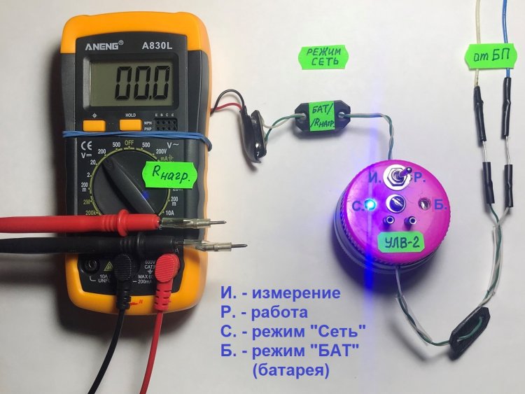 УЛВ2, работающий в режиме «Сеть» (от сетевого БП). Через УЛВ2 подаётся питание на мультиметр (Батарея мультиметра разрядилась и мультиметр запитали от сетевого БП).