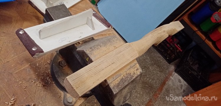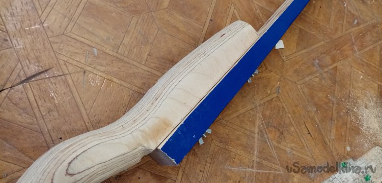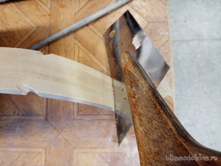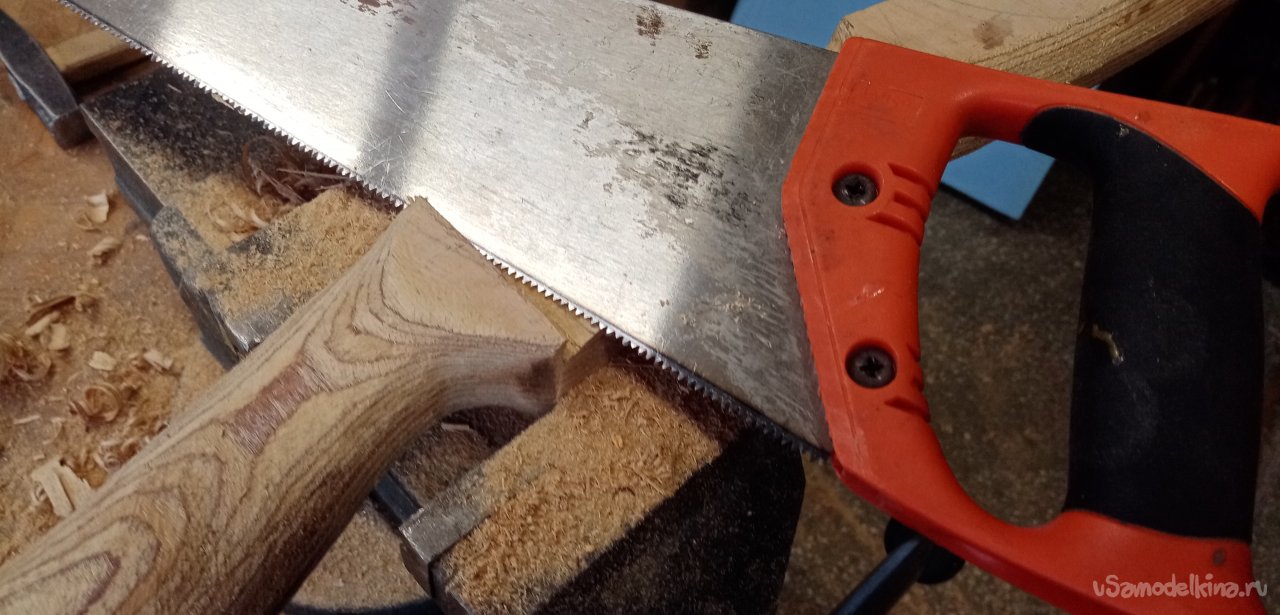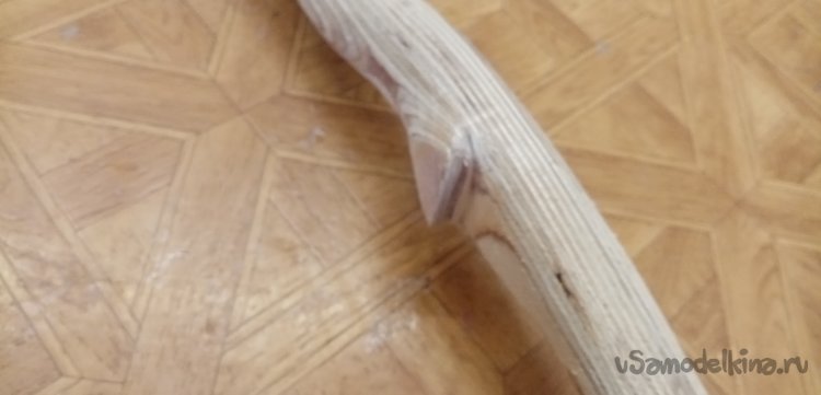 Затем на приливе рукоятки, при помощи пилы по дереву. Вырезаю небольшое ложе для стрелы.