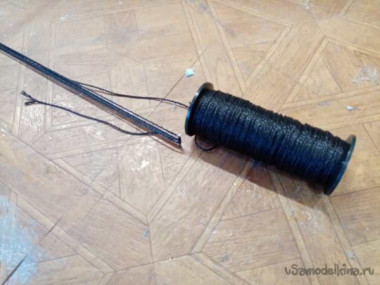 Распускаю петли на тетиве. Нужнее её посильнее свить и напарафинить. Дополнительно свиваю при помощи шуруповерта. Натираю свечкой.