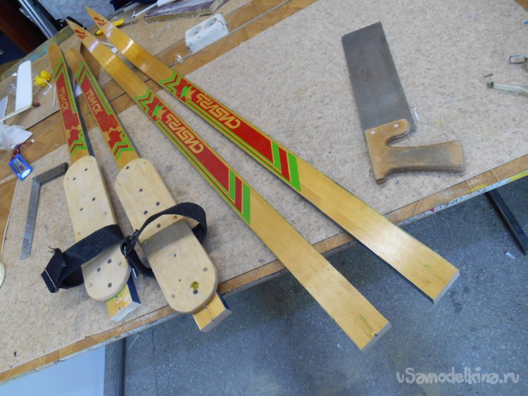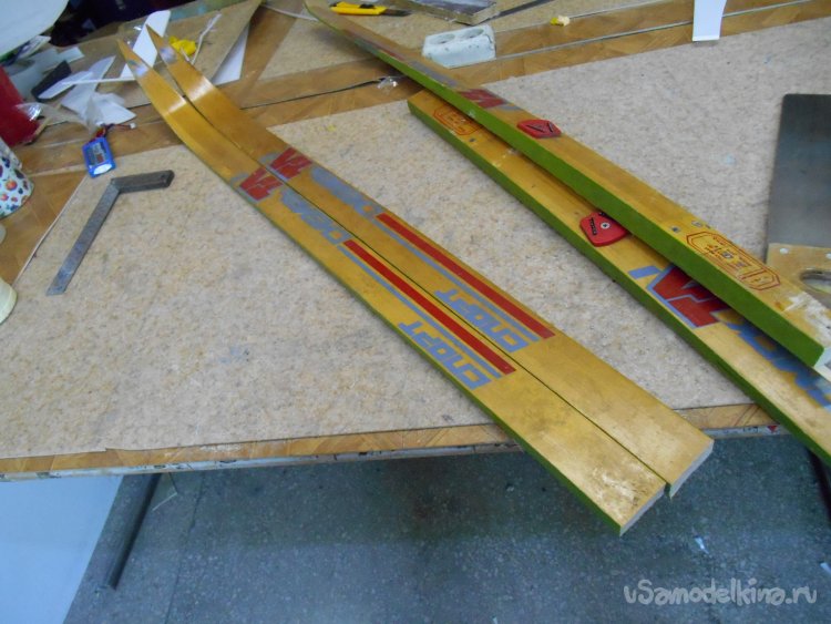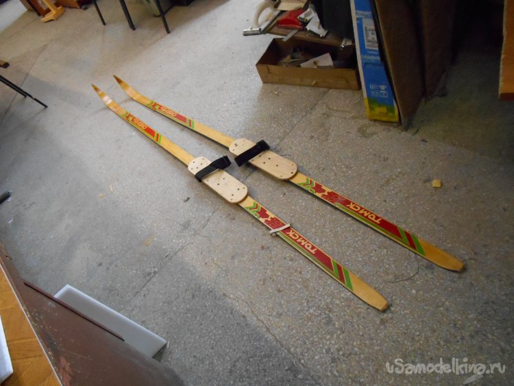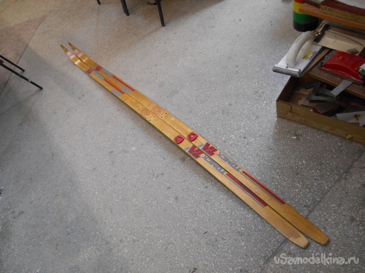 Многие решения часто приходят совершенно случайно. Однажды, не торопясь прогулочным шагом, следую на работу, обнаружил выброшенные лыжи. Совершенно машинально, подобрал и осмотрел. Целые, с креплениями. Принес в моделку. Куда использовать еще не решил. Лето на дворе. Такие вот выходные данные изделия.