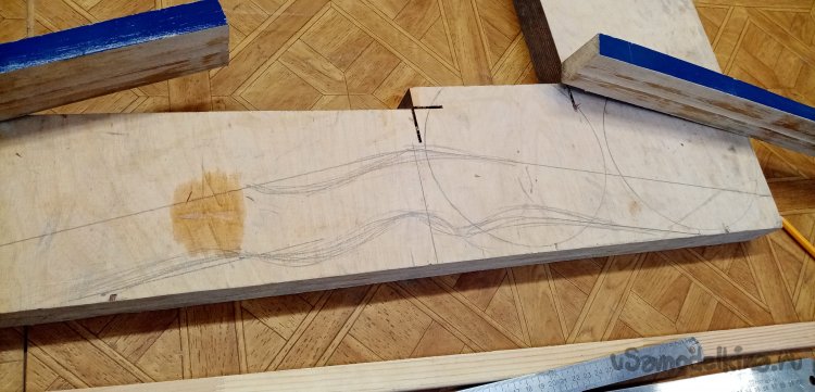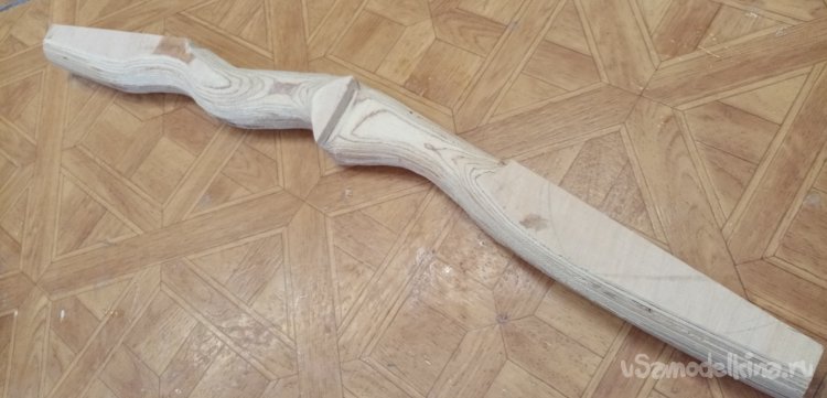 Нашелся обрезок толстой фанеры. Как раз в 40 мм. Прями на куске размечаю рукоятку. Примерный контур помню еще с детства. Определяю угол наклона рогов. Хотя у настоящего лука нет предварительного наклона. Но это лыжи. Они не выдержат сильного изгиба.