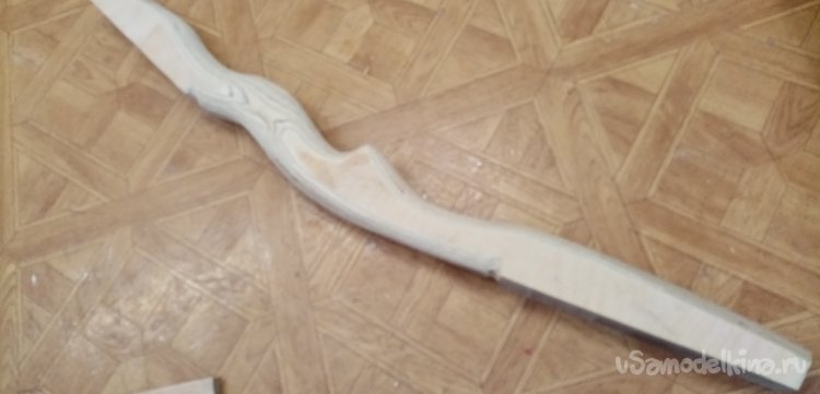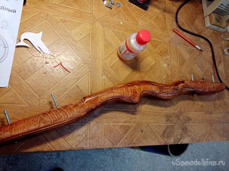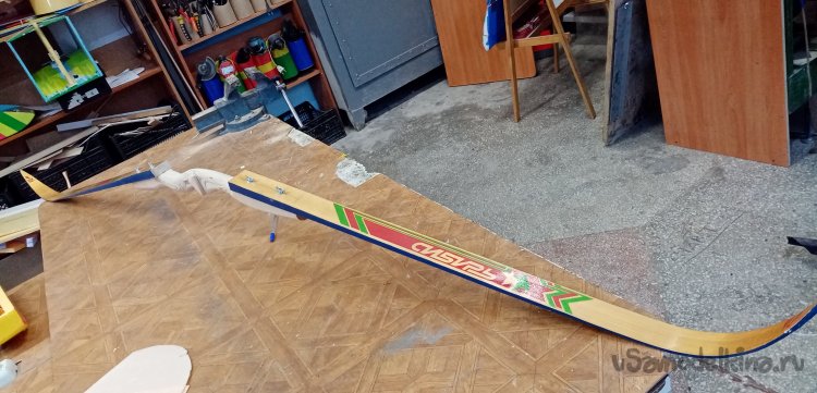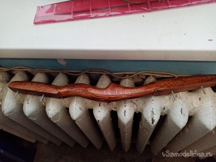 Теперь буду доводить его до рабочего состояния. Для начала, нужно выяснить не сломаются ли рога при натяжении. Поскольку не знаю как качественно изготовлены эти лыжи. Как проклеены слои между собой. Давно делал луки из лыж фирмы «Сортавала». Были такие очень гибкие лыжи. Там практически не делал предварительного наклона рогов.
