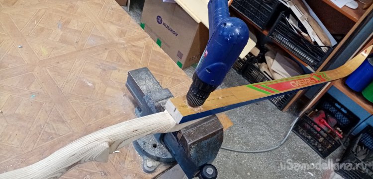 Примотав рог в нужное место и зажав всю конструкцию в тиски. Начинаю сверлить отверстия в рукоятке.