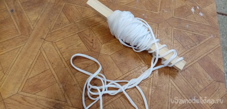 Натягиваю с запасом пять слоев ниток между двумя вбитыми гвоздиками.