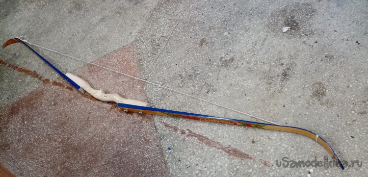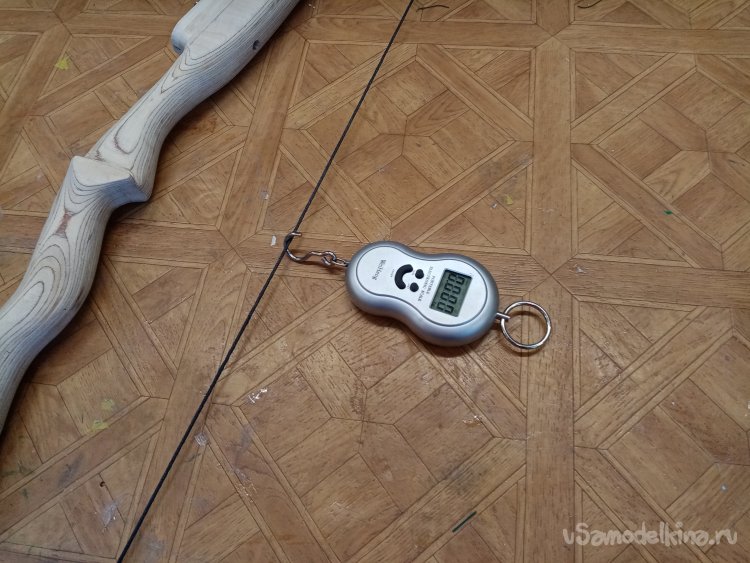 Собираю лук. Меряю усилие. Получилось в 15 килограмм. Ничего не хрустит, не трещит. Пока этого хватит поиграть в индейцев.