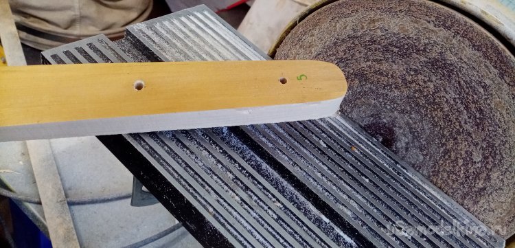 После доводки площадок, продолжаю уже окончательную шлифовку рукоятки при помощи полоски шкурки и утюжков. Для большей гладкости получаемой поверхности есть приемчик. После шлифования немного смачиваю заготовку и просушиваю. Ворс древесины, вдавленный поры шкуркой поднимается. Его опять шлифую.
