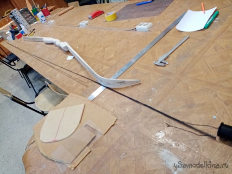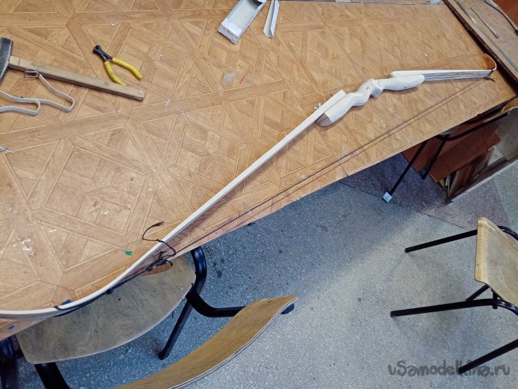 В рогах формирую выемки при помощи рашпиля и надфилей для фиксации тетивы. Тестовую тетиву делаю из попавшего под руки шнура. Он немного тянется, но это не важно. Глваное приверить прочность рогов и угол их установки.