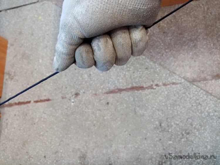 Растираю парафин рукой в перчатке и тряпкой. Хорошо нагревая. Все нитки слипаются в единое целое. После на концах делаю новые петли. Несколько раз корректирую длину тетивы. Делается это просто, завязывая узелки. Каждый узелок, минус 5 мм. Уже с несколько большим натяжением будет устанавливаться тетива. Слегка сгибая рога.