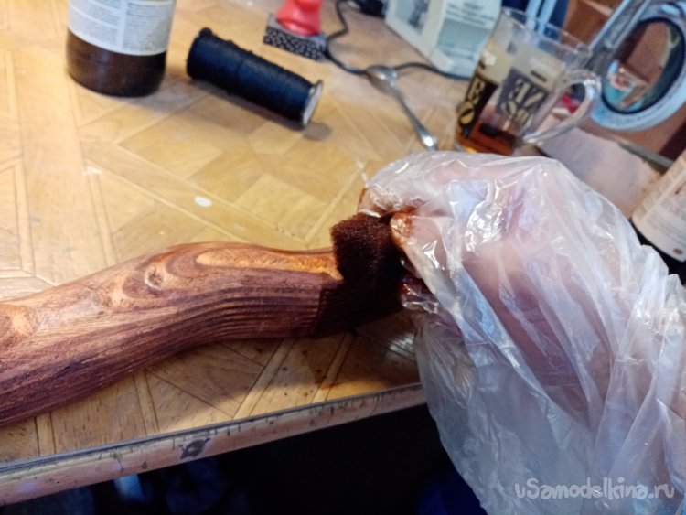 Больше понравилась коричнева. Сейчас буду морить. Одноразовые перчатки куда-то подевались. Не беда. Засовываю руку в полиэтиленовый пакет. При помощи поролона наношу морилку на рукоятку. Просушиваю на батарее. Хорошо зимой все быстро сохнет на горячем радиаторе.