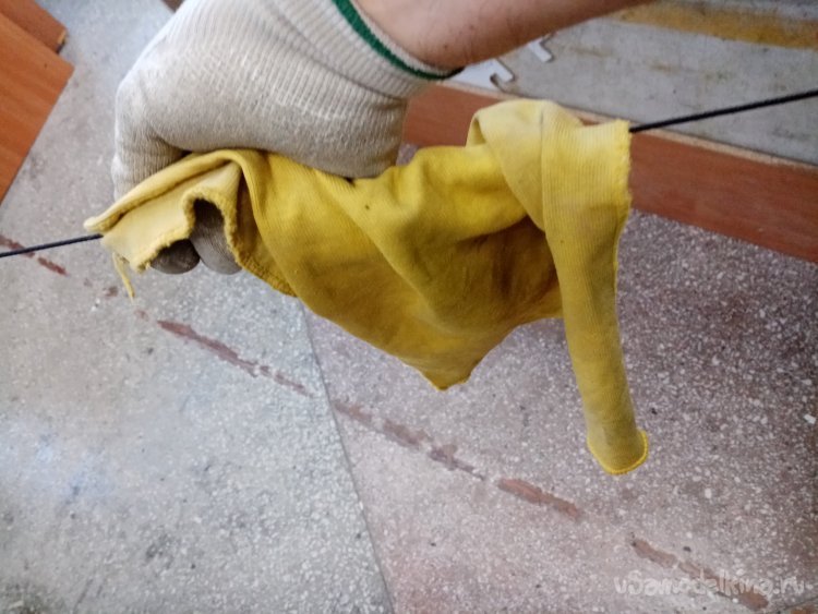 Затем растираю, расплавляю парафин руками в перчатке. Нитки склеиваются в единое целое. Тетива становится немного скользкая. Самое то, что нужно.