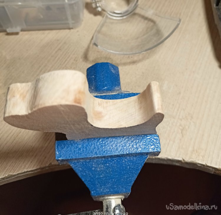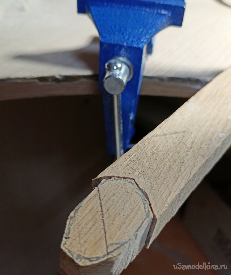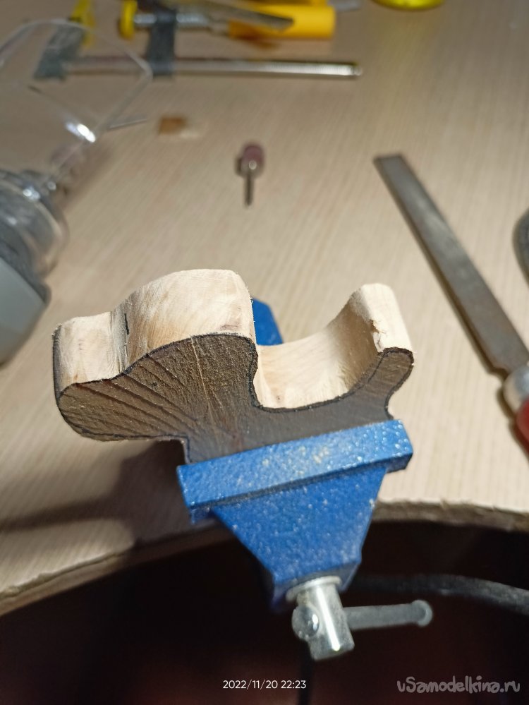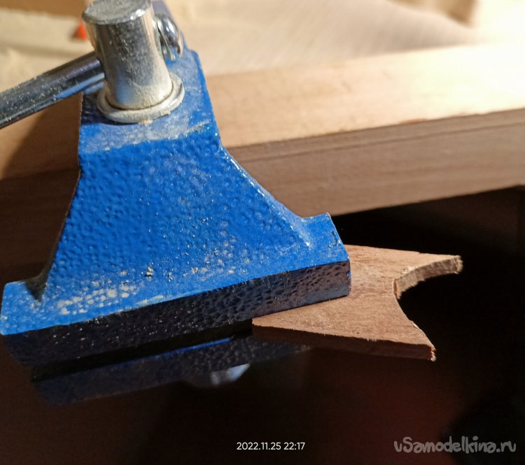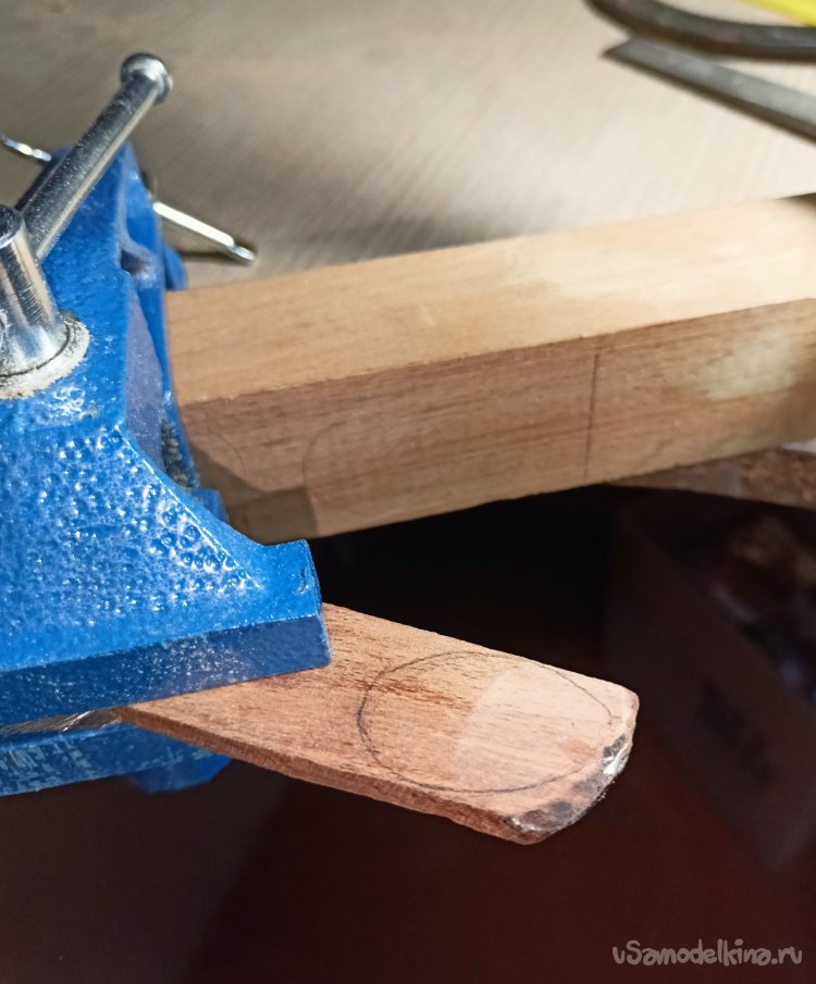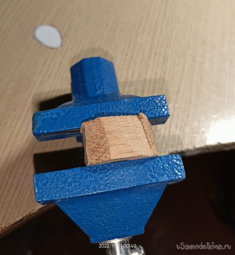 Зажимаем в тисках брусочек красного дерева по такой же схеме.