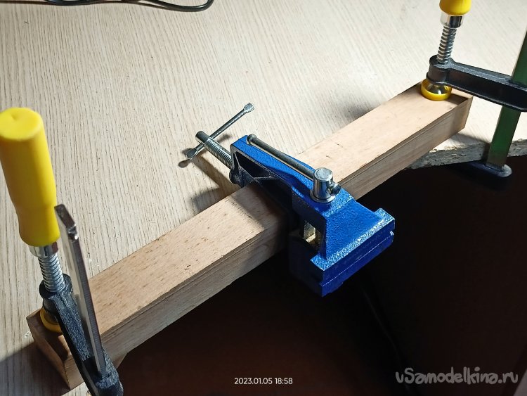 Рейку прижимаем струбцинами к столу, тиски зажимаем на рейке горизонтально.