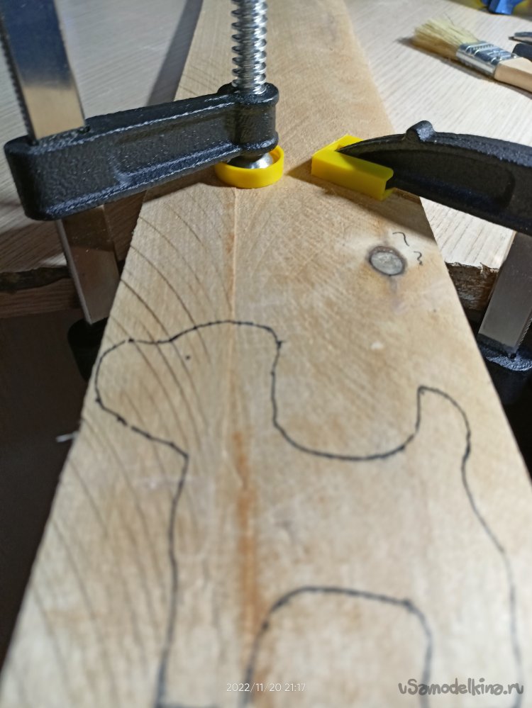 Зажимаю двумя струбцинами доску с разметкой (чтобы она не скользила по столу).