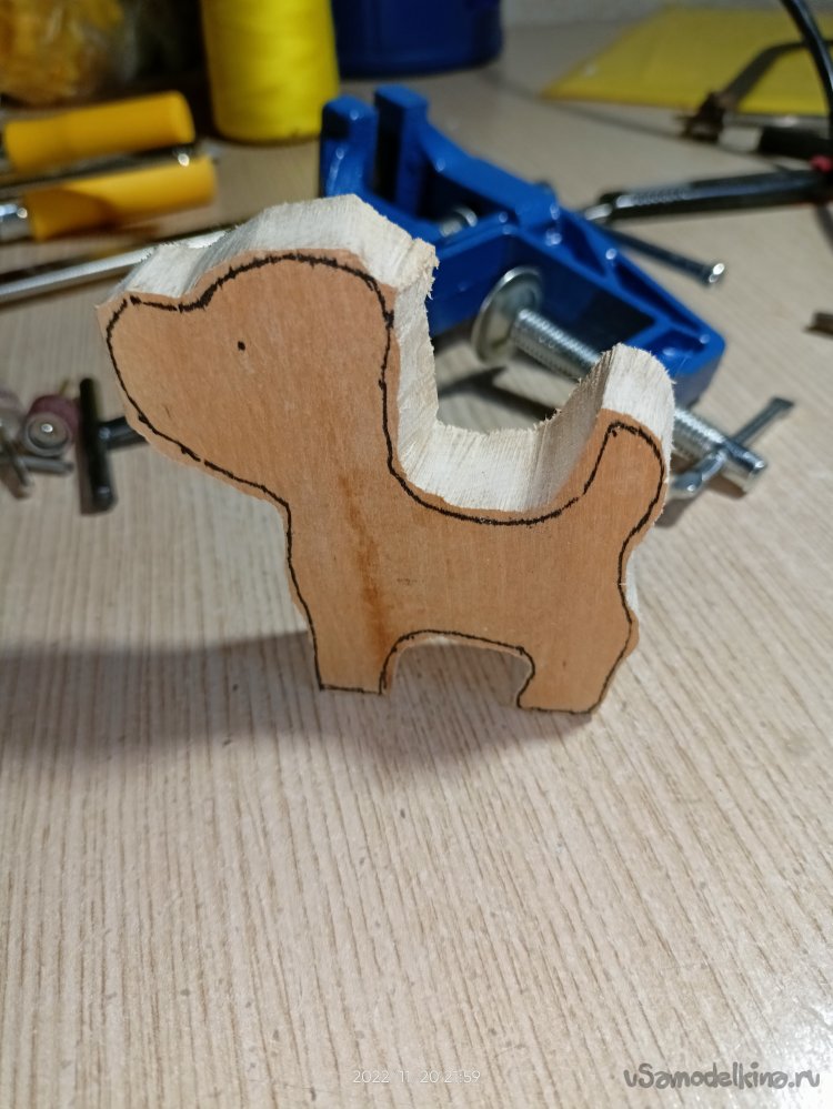 Ручным лобзиком выпиливаем фигурку по нарисованному контуру, не забывая оставлять припуски, разворачивая заготовку для удобства выпиливания.