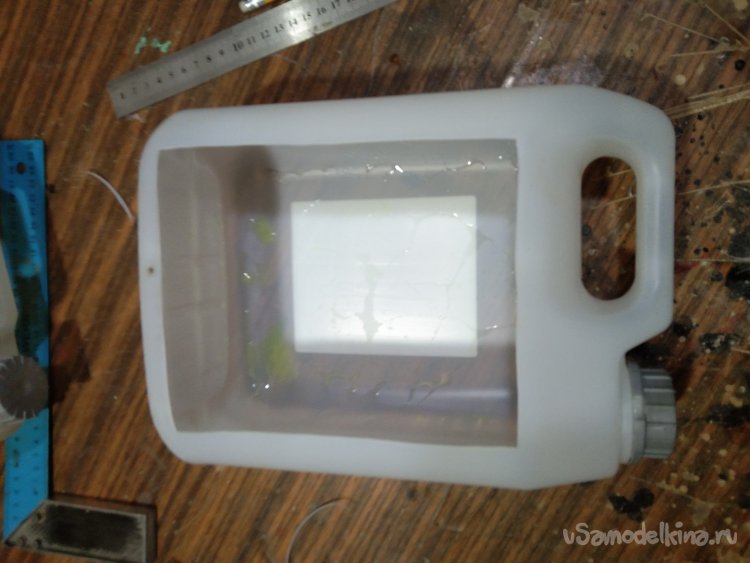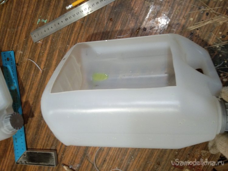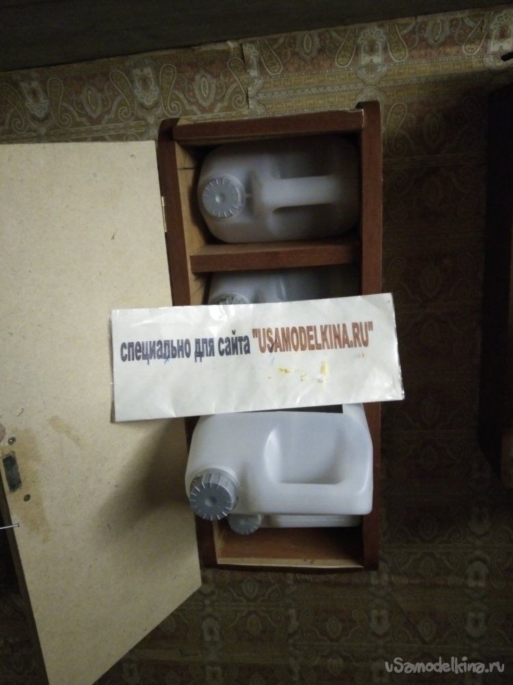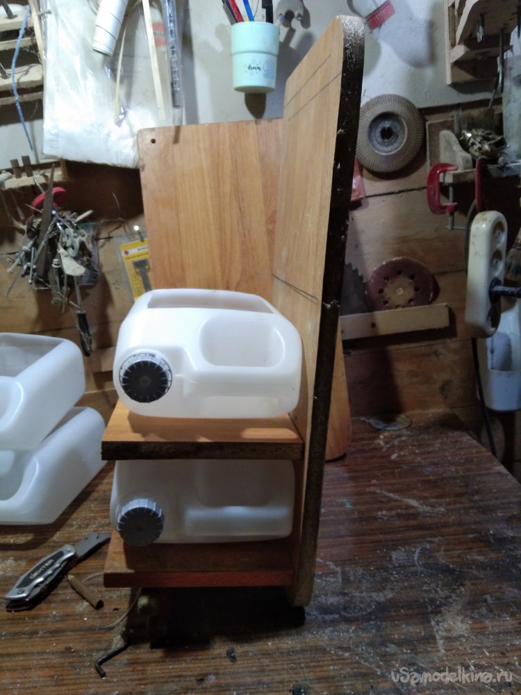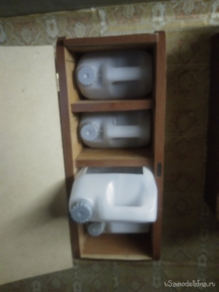 Теперь внутрь шкафа, на полочки, вставляю ящички, которые я сделал заранее. Они сделаны из пластиковых канистр из под стеклоомывающей жидкости для автомобилей. Срезал одну из боковых частей так, чтобы получилась емкость. Для этого использовал обычный канцелярский нож. Стенки канистр тонкие и нож легко справляется со своей задачей. Далее немного подравнял края срезов и зачистил наждачной бумагой. Края в некоторых местах были очень острые и была реальная возможность поранить руки. Получились очень удобные и глубокие ящики, которые к тому же удобно вытаскивать благодаря имеющимся у них ручкам. Вообще, канистры это очень удобный материал для изготовления разнообразных девайсов для хранения. В моей мастерской они использованы не только в этом проекте, но и нескольких других. Вы их можете найти, посмотрев все мои самоделки.