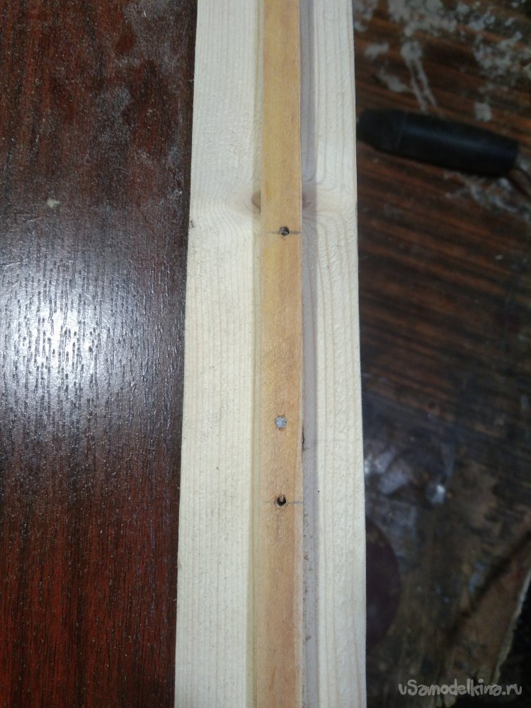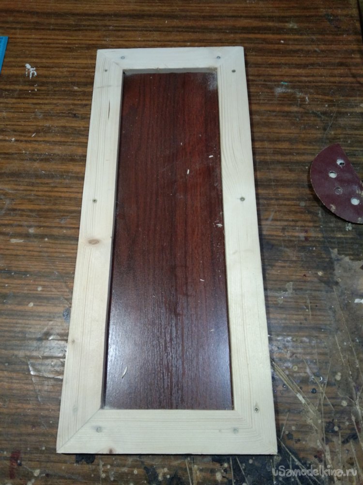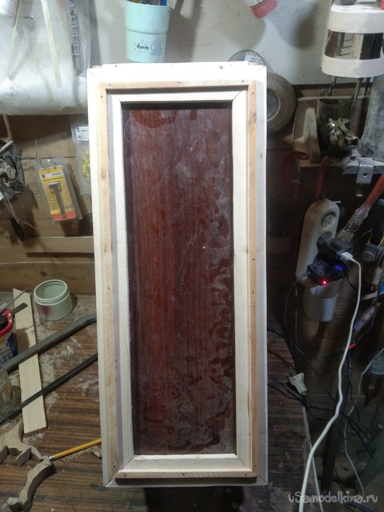 Далее необходимо закрыть заднюю часть шкафчика и сделать дверку. Для этого я использовал стеновые панели, остатки которых так же у меня были в закромах. Заднюю часть закрыл с помощью небольших гвоздиков. Этого достаточно. С дверкой пришлось немного повозиться. Сама панель не очень толстая, а к ней еще необходимо прикрепить петли. Если их устанавливать на плоскость панели, то дверка не будет открываться до конца. Поэтому решил сделать окантовку по периметру сосновой планкой, размеры которой 10*40 миллиметров. На торцовочной пиле сделал срезы под 45 градусов на каждой заготовке. Нанес на них клей и прижал саморезами как струбцинами. Установил петли и навесил дверку. Открывается достаточно хорошо и полностью. Чтобы закрыть саморезы на окантовочной части планок, хотя этого можно и не делать, использовал оставшиеся буковые штапики, оставшиеся от изготовления кирпичиков для другого проекта. Их так же отрезал под 45 градусов, приклеил и закрепил гвоздиками. Стало намного симпатичнее.