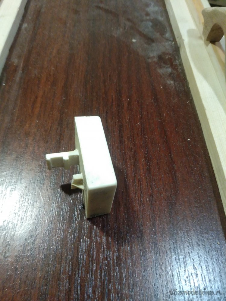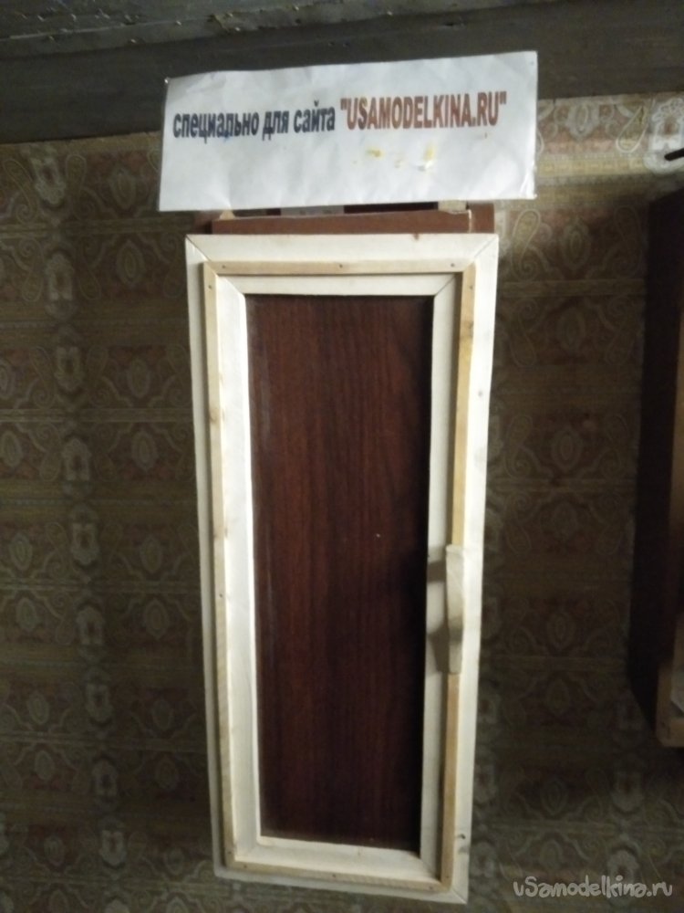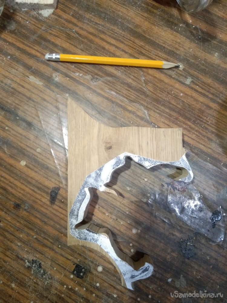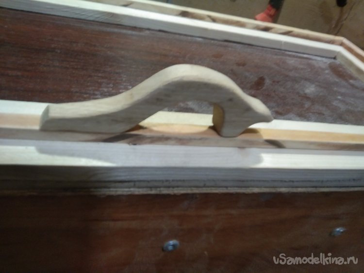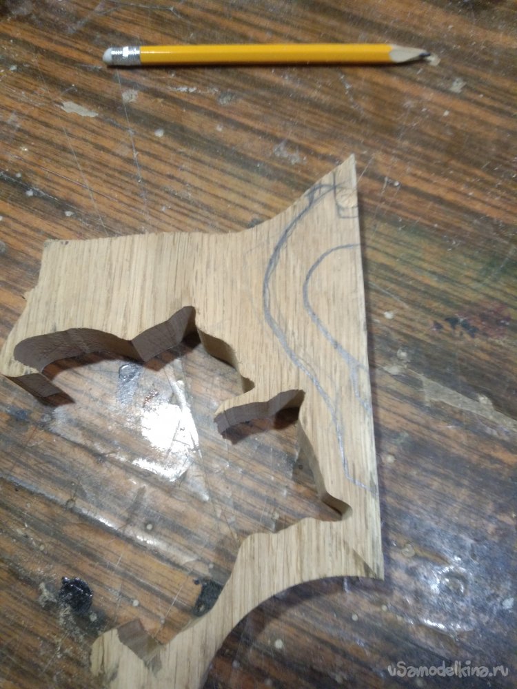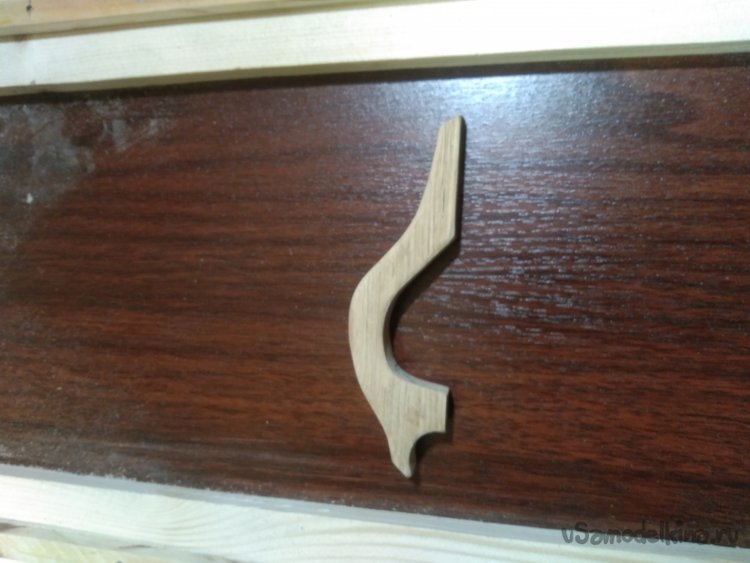 Далее необходимо сделать ручку на дверку. Изначально хотел без всяких заморочек установить обычную ручку от какого-то советского шкафчика, которых у меня много. Но потом передумал. Взял дубовую обрезь, оставшуюся после выпиливания фигурок и сделал из нее. Нарисовал форму ручки и лобзиком ее выпилил. Отшлифовал. Получилось очень даже "в тему". Сделал разметку на дверке, высверлил отверстия под саморезы для крепления ручки и установил ее на положенное место.