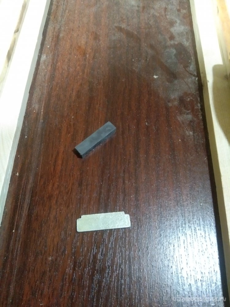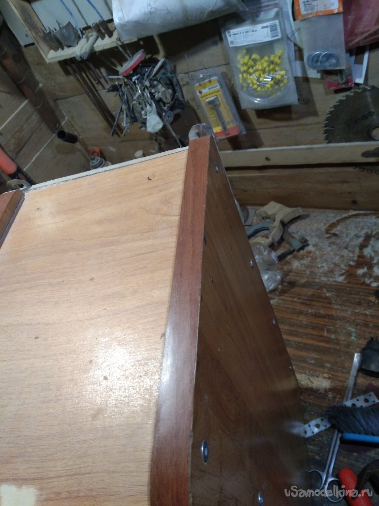 По задумке дверка должна прижиматься к шкафчику с помощью магнита и металлической планки. Поэтому использовал для этой цели готовый магнитный держатель, который используют в сетевых магазинах для показа какой-либо информации. Разобрал его и вытащил оттуда и магнит, и металлическую планку. Сделал на торце шкафчика углубление для магнита, а на дверце - для металлической плашки. Далее необходимо торцам шкафчика придать более презентабельный вид. Для этого использовал кромочную ленту. Старая отвалилась, а та что осталась - была срезана. Приступил к оклейке торцов. Чтобы лента приклеилась, ее необходимо приложить к поверхности и нагреть. Клеящий слой расплавится и намертво припаяет ленту к изделию. У меня для таких работ есть специальный утюг, который я неоднократно использовал в таких целях. Прикладываю ленту и горячим утюгом глажу по верхней стороне ленты. Я ничего под утюг не подкладываю, провожу как есть, лента не портится. Далее прорезаю отверстие в ленте, куда устанавливаю магнит. Все проверяю. Магнит хорошо и плотно притягивает дверку к шкафчику.