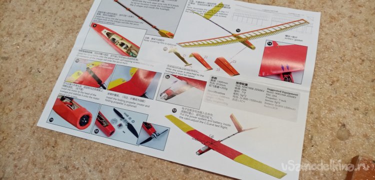 Внутри набор для самостоятельной сборки небольшого планера. С «полным фаршем», наклейки и подробные, даже цветные инструкции.