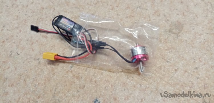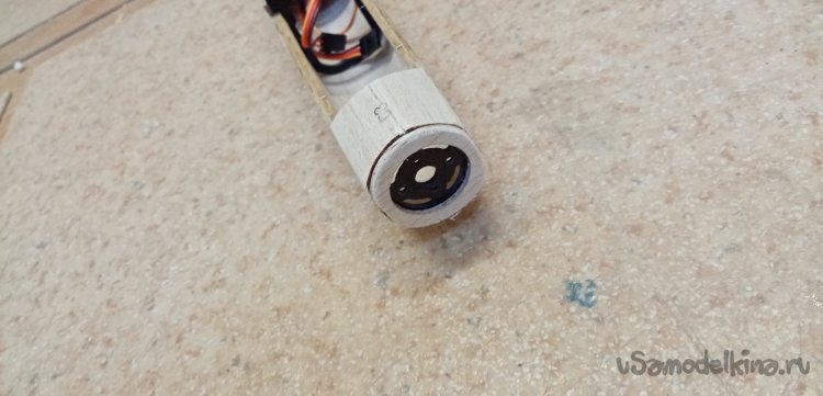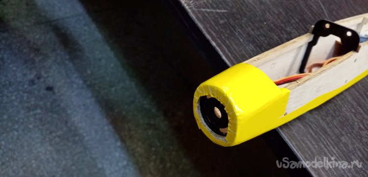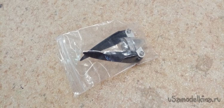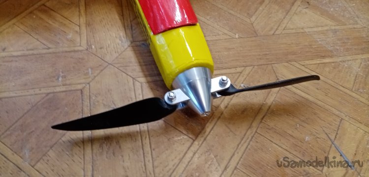 В носовой части закрепляю мотор с регулятором. На вал мотора прикручиваю хаб со складывающимися лопастями.