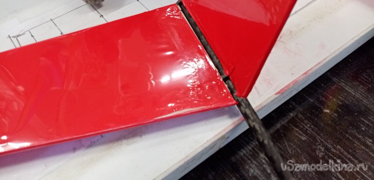 Плоскости хвостика оклеиваю уже для контрастности красным цветом. Но есть тонкость. Крепления хвостового оперения изготовлены так, что установить на место уже обтянутый элемент не представляется возможным. Поэтому пришлось, сначала приклеит его на крепления к кончику хвостовой балки, затем обтягивать. Но эту замороченную трудность проектировщиков успешно преодолел.