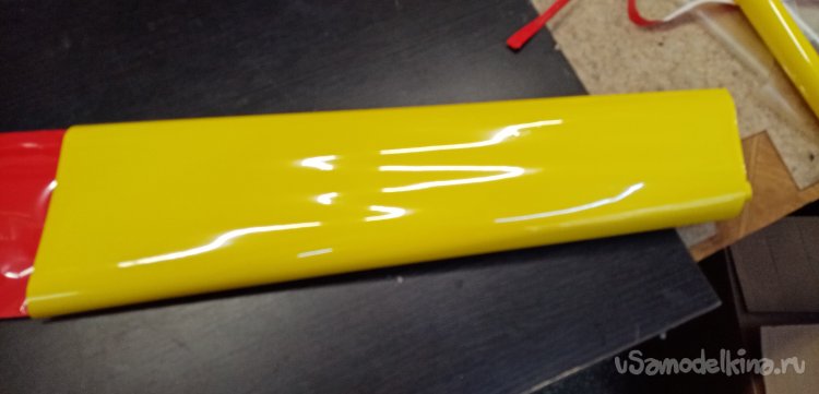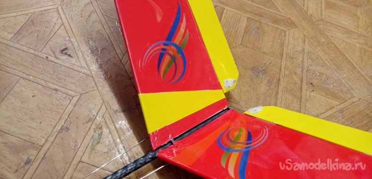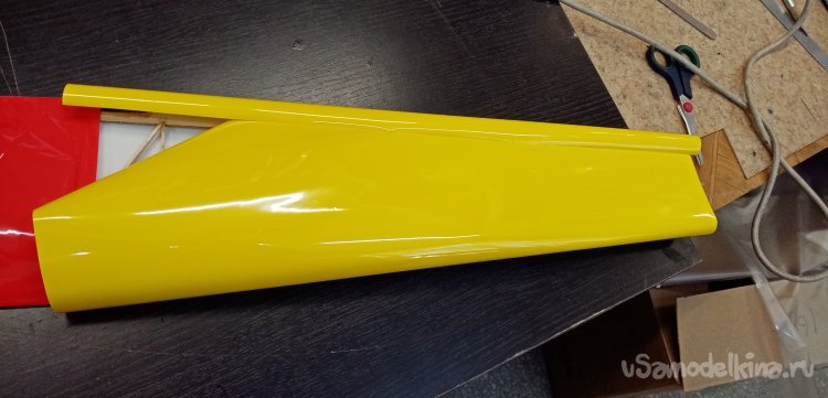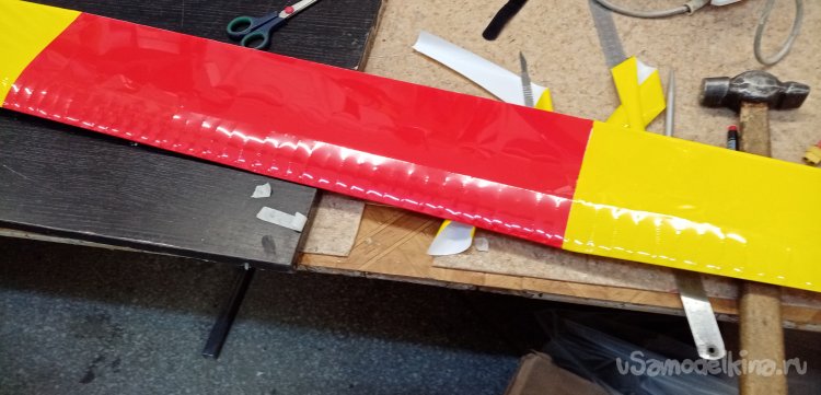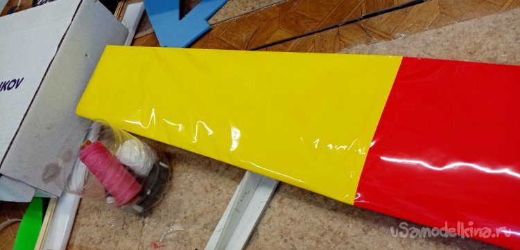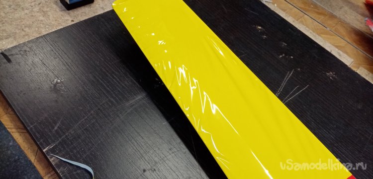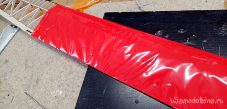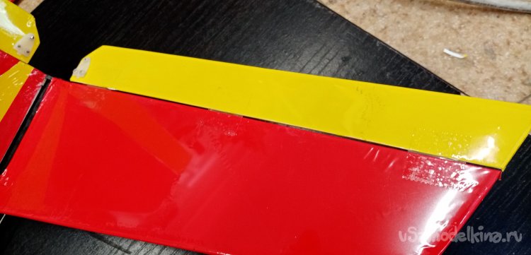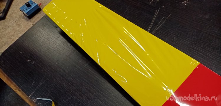 Можно переходить к обтяжке крыла. В инструкции дан хороший вариант расположения цветной пленки на крыле. Красная середина и желтые ушки. Мне нравится. Так и буду действовать.