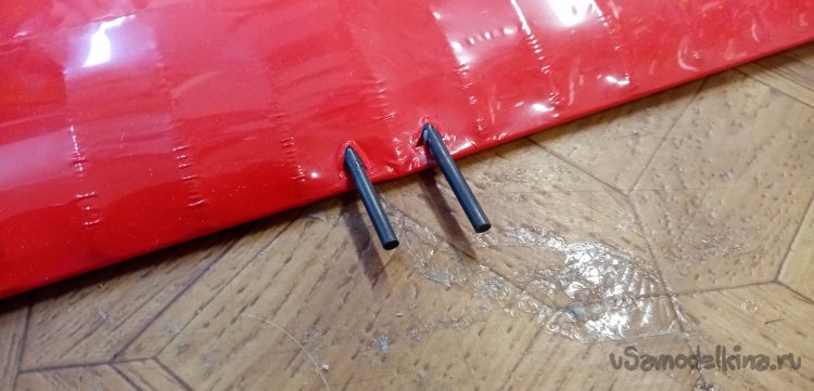 Аккуратно прорезав покровную пленку, устанавливаю карбоновые трубочки в приготовленные отверстия. Заклеиваю на циакрин. Мой хороший КОСМОФЕН.