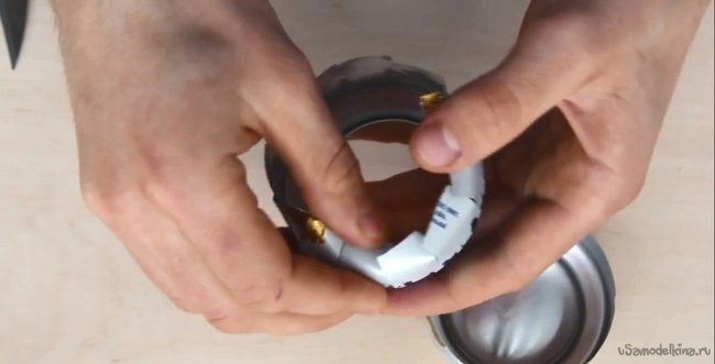 Наша спиртовая горелка практически готова, и нам остается лишь собрать ее составляющие части в одно целое. Для этого слегка складываем нижнюю часть верхнего куска баночки, чтобы она с легкостью вошла во вторую.