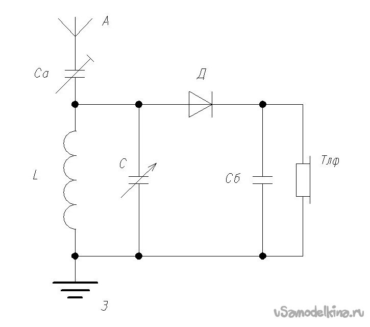 Рис. 11 Детекторный радиоприемник, схема принципиальная. Сб – блокировочный конденсатор емкостью в 510…4700 пФ, телефоны - ретро конструкции с электромагнитом и жестяной мембраной, высокоомные. Са – антенный конденсатор в несколько десятков пикофарад, лучше переменный. Для регулирования ослабления влияния антенны на колебательный контур, что повышает избирательность.