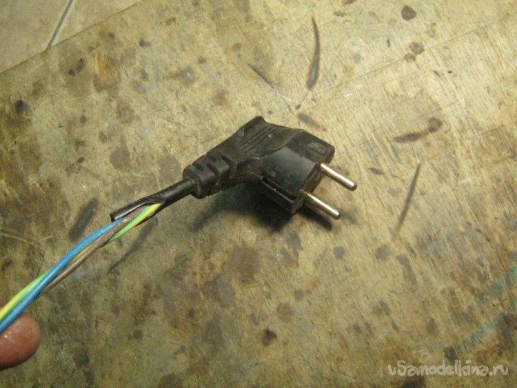 Фото 3. Для «подвода» подобрал фабричный сетевой шнур с мощной вилкой. Разделал его – зачистил почти весь от внешней жесткой изоляции, обрезал провод заземления, изолировал место разделки около вилки термотрубкой.