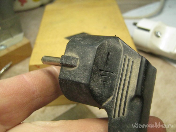 Фото 4. Пометил назначение проводов при удобном положении вилки в розетке. На пластиковом корпусе вилки и липкой биркой на конце провода. Зачистил концы проводов, залудил с канифолью, соскреб остатки остывшей канифоли.