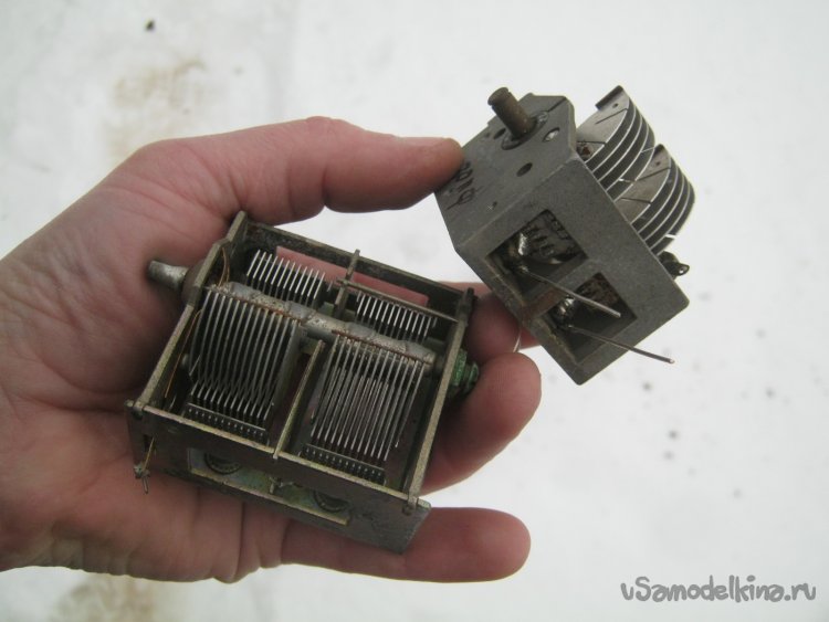 Фото 5. Колебательный контур нашего приемника - параллельного типа с конденсатором переменной емкости. Использовал имеющийся сдвоенный конденсатор с удаленной каждой второй пластиной и последовательно включенными секциями – чтобы не было шорохов и потрескиваний от подвижного контакта. Максимальная емкость – 30 пФ. Рядом, стандартный сдвоенный 2 х 12…496 пФ часто попадавшийся в недорогих ламповых приемниках низкого класса. Заметим кроме прочего и литую против штампованной рамы, а это термостабильность, хотя и не слишком важная в нашем случае.