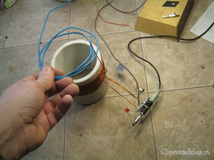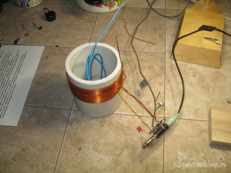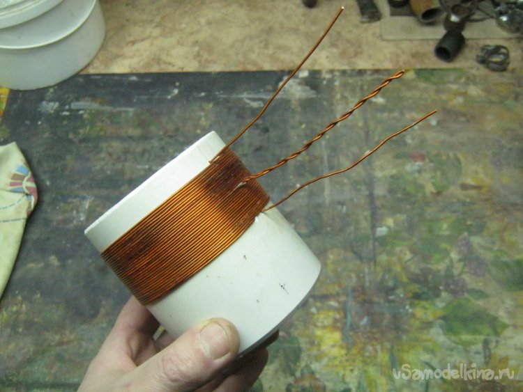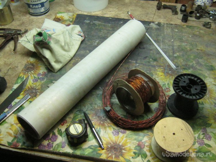 Фото 6. Покопавшись в коробках и прочих закромах добыл провод и заготовку каркаса контурной катушки. Здесь нужно сказать, что простейшие радиоприемники оперируют с крайне малыми наведенными сигналами и потери в катушке имеют значительный вес. Оттого – чувствительный диаметр провода и каркаса катушки. Здесь, нашелся старый обмоточный провод Ø1 мм и пластиковая толстостенная труба, втулка от катушки с пленкой, внешним Ø95 мм. Пластик тяжелый и хрупкий, отчасти напоминает полистирол, хотя и не он.