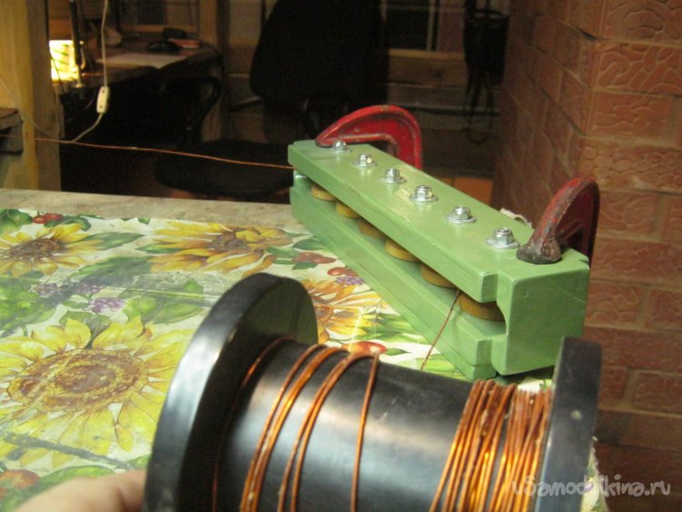 Фото 8. Пропустил мятый провод через самодельную роликовую выравнивалку, смотал на катушку.